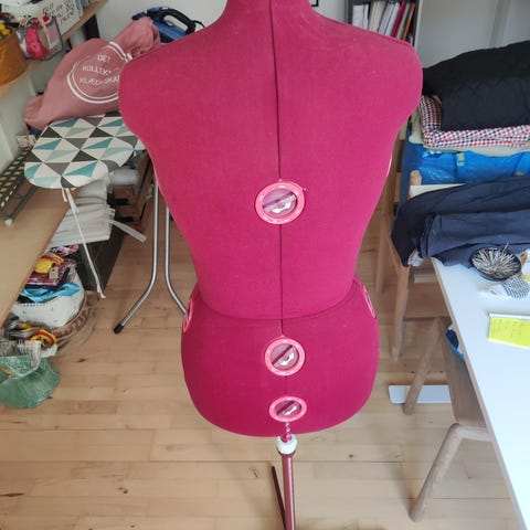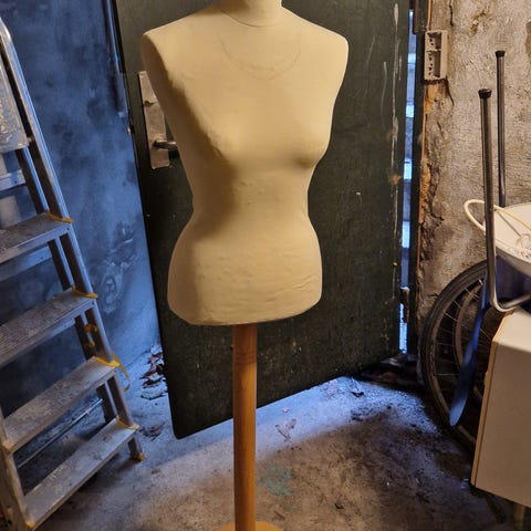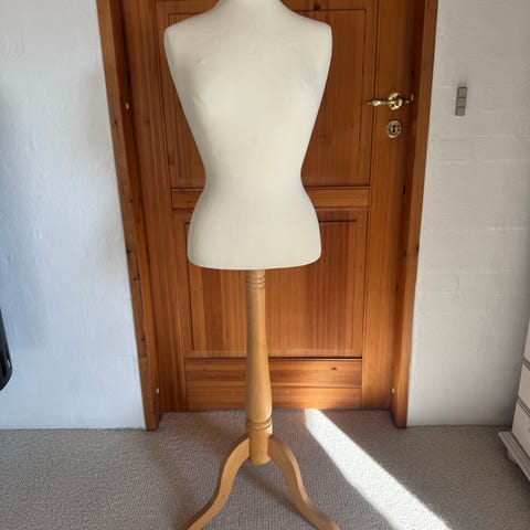 Dame gine/mannequin i hvid med træfod. Overkrop i kvindemodel med let markeret barm og talje. Monteret på rund træfod med træstang. Højden kan justeres via beslag under kroppen. Velegnet til syning, tilretning af tøj eller udstilling af beklædning i butik eller showroom.