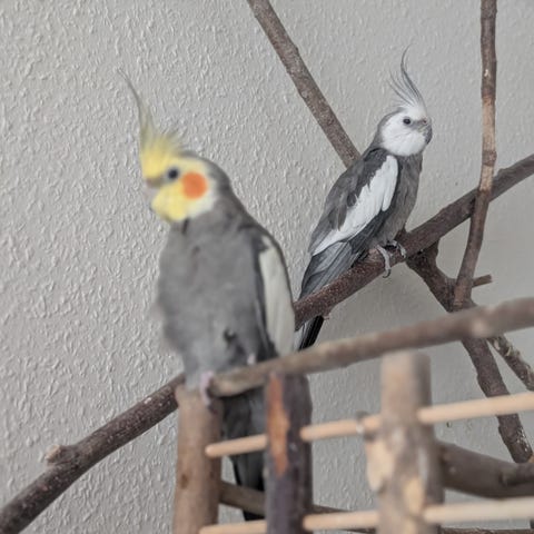 Vi sælger vores to nymfeparakitter på 2 år, som er rolige og vant til daglig kontakt. De er meget nysgerrige og elsker opmærksomhed.