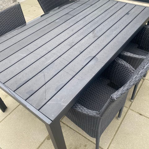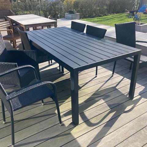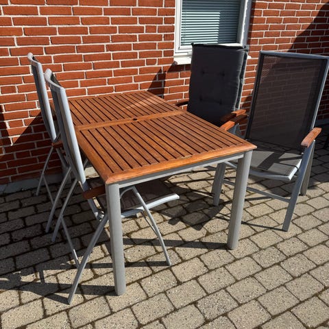 Havebord og stole sæt i hvid metal og teak-træ. Kvadratisk havebord (150x150) med bordplade i lameller af teak-træ. Sættet inkluderer matchende hvide metalstole med rund sædeplade og ryglæn med lodrette metalstænger. Egnet til udendørs brug på terrasse eller i have som spiseplads. Bordet giver plads til flere personer og kan anvendes til måltider, ophold og andre aktiviteter udendørs. Sælges også uden stolene.