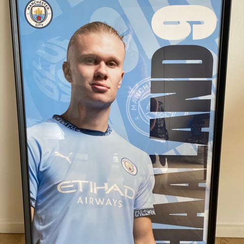 IKEA billedramme med fodboldplakat. Rammen har sort kant og bagplade med beslag til ophæng. I rammen sidder en plakat med fodboldmotiv samt en plakat med en fodboldspiller haaland. Velegnet som vægdekoration i for eksempel børneværelse eller opholdsrum. B70 h100 175 for begge