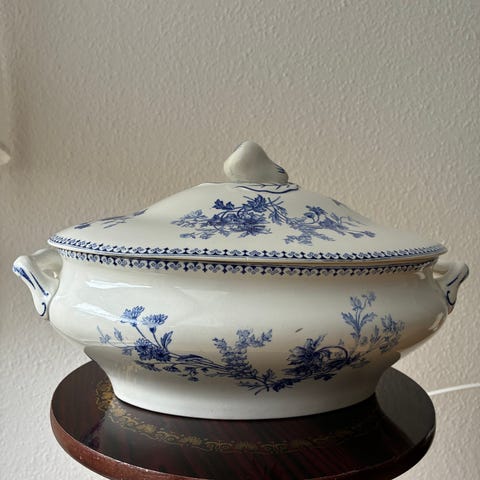 Dette er en antik Sarreguemines Fontanges suppeterrin i blåt og hvidt fajance, sandsynligvis fra slutningen af det 19. eller starten af det 20. århundrede.