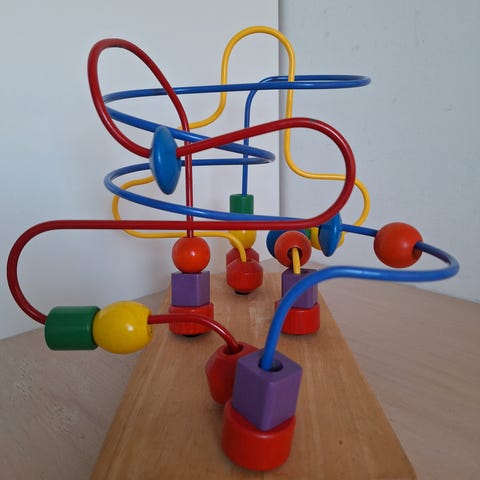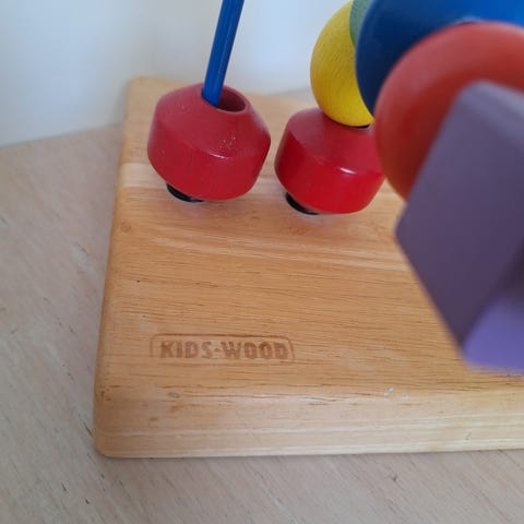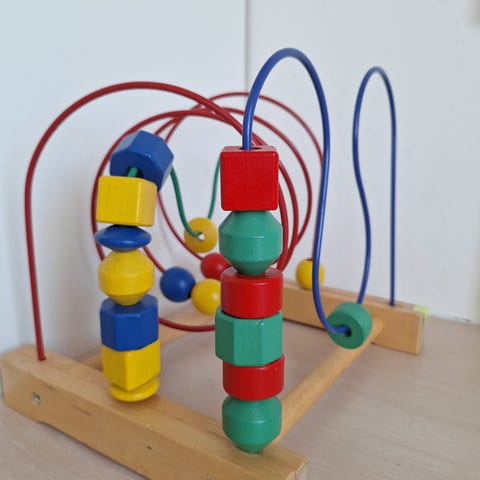 aktivitetslegetøj trækuglebane i træ med farverige metalbuer og trækugler. Legetøjet består af flere buede skinner i metal, monteret på en træramme, hvor kugler i forskellige former og farver kan skubbes rundt. Egnet som motorik- og sanselegetøj til mindre børn, hvor barnet kan øve hånd-øje-koordination og finmotorik ved at flytte kuglerne langs banerne. (Ikke brio)