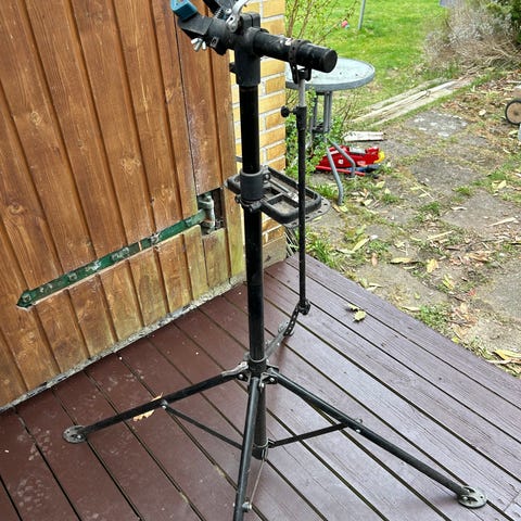 Cykel reparationsstativ i sort med justerbar højde. Stativet har et sammenklappeligt trefodsstel og en roterbar spændemekanisme til fastgørelse af cykelrammen. Kæberne er polstrede for at beskytte rammen. Der er integreret bakke til værktøj og smådele. Egnet til vedligeholdelse og reparation af forskellige typer cykler i hjemmet eller værkstedet.