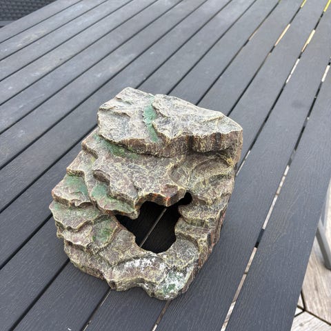 Dekoration til akvarium i form af en kunstig træstamme i brunlige nuancer. Emnet er udformet som et stykke hul træ med flere åbninger og fordybninger, som fisk og andre akvariedyr kan svømme igennem eller gemme sig i. Overfladen er struktureret med detaljer, der efterligner bark og små områder med grønlig farve, som kan minde om alger eller mos. Velegnet som skjulested og dekoration i akvarium eller terrarium. Materialet er kunstigt/resin-lignende og beregnet til brug under vand eller i fugtige miljøer.