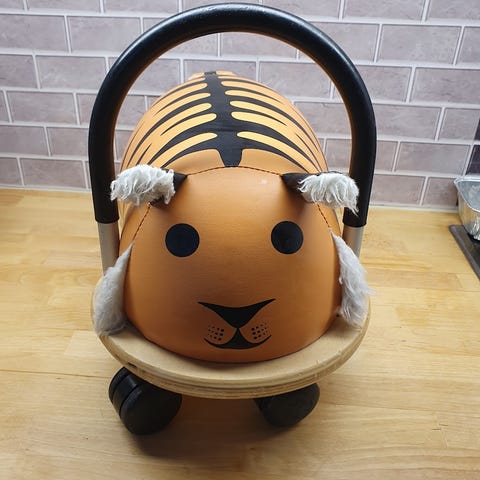 Sød tiger Wheely bug i den lille størrelse. God som gåvogn og til at sidde og køre rundt på. Kun brugt indenfor, men bemærk slid på halen.
