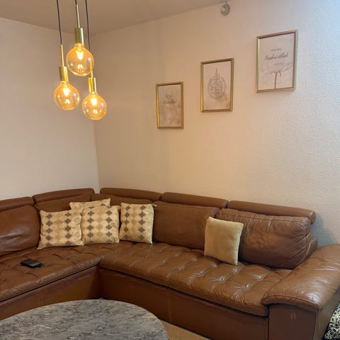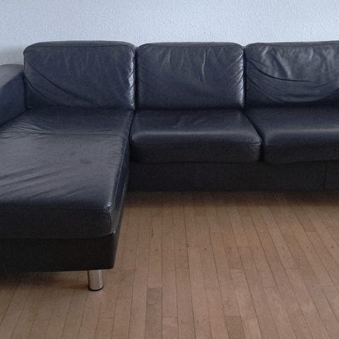 Sofaen er i rigtigt læder og har fra ny kostet ca. 40.000 kr. Desværre er farven gået af på det ene sæde. Måske kan det repareres. Vi har lagt et tæppe over. Vi har fået ny sofa og derfor skal denne afhentes inden for April måned på Østerbro lige ved Svanemøllen station.