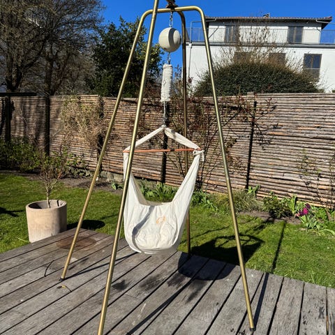Slyngevugge fra Moonboon i støvet grøn (seagrass) med tilhørende stativ.