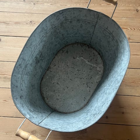Børnebadekar, emalje/jern, L. 100 cm. B.52 cm. H. 27 cm. Fra første halvdel af 1900 tallet