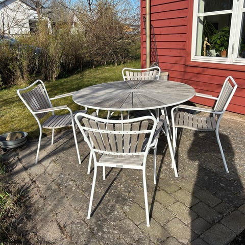 De 4 Marguerit havestole har ergonomisk sæde og ryg. Stellet er i pulverlakeret aluminium. Sæde, ryg og armlæn er i højkvalitets teak. Dertil er der tilkøbt 4 sæde- og ryghynder.