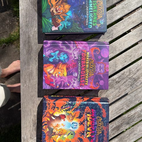 Lakserytterens serie “Legender fra Odysia": "Griskernes hemmelighed", "Månebibliotekets forbandelse" og "Devastys’ hævn". Bog 1 har brugsspor (se fotos) bog 2 er som ny🍓