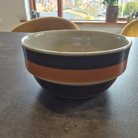 Fin gammel skål og 5 tilhørende tallerkener. Grøn med orange kant.
