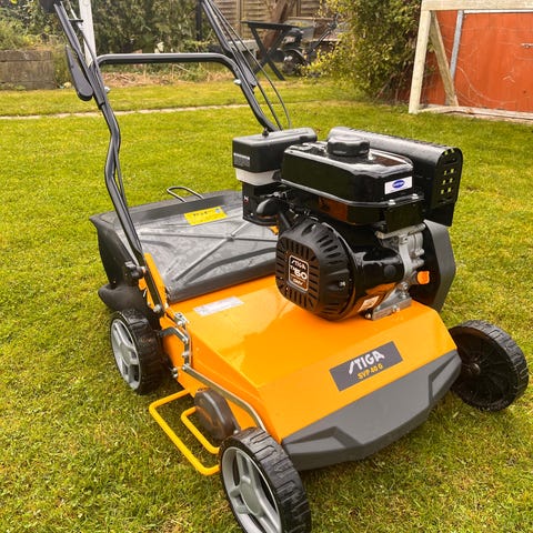 AL-KO benzin plænelufter. Vertikalskærer, Maskinen har benzinmotor og med håndtag i metal. Egnet til luftning og pleje af græsplæner i private haver. Maskinen har hjul for nem manøvrering og brændstoftank placeret oven på motoren. Velegnet til almindeligt havebrug, hvor der ønskes mekanisk luftning af plænen. Rivevalsen som medfølger er ubrugt, har altid stået indenfor, uden opsamler