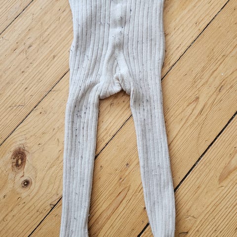 Uld strømpebukser i grå med lyserøde stjerner. Størrelsen hedder 68/74, men vi har kunne bruge dem længere end det