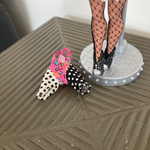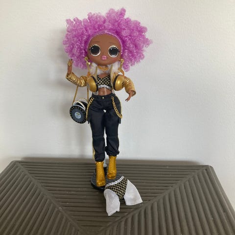 L.O.L. Surprise dukke med langt orange hår og store øjne. Dukken er iført en sort og blå kjole med mønster samt bælte i sølvfarve. Den har orange støvler med mønster og blå hårbøjle med stjerner. Der medfølger en gennemsigtig stander, så dukken kan stå op, samt en lille sort hårbørste. Velegnet som legetøj til børn eller som samlerfigur.