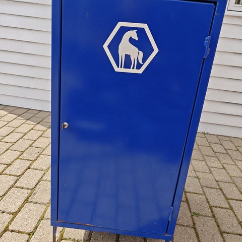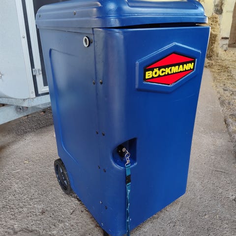 Böckmann sadelskab på hjul i sort plast/metal. Skabet har låge foran og låg i toppen samt indvendige kroge og holdere til opbevaring af 2 sadler, trenser og andet. Står i Ballerup