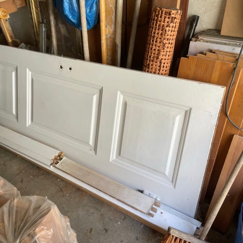 Hvidmalet indvendig fyldningsdør i træ. Døren har klassiske rektangulære fyldninger på begge sider og er udstyret med hængsler og messingfarvet dørgreb/roset. Der ses brugsspor i malingen samt hul til låsekasse. Velegnet som indvendig dør i bolig, fx i stue, værelse eller gang. Karm medfølger ikke og skal eventuelt tilpasses separat.