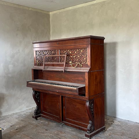 Klaver med buet front til gratis afhentning. Trænger nok til at blive stemt.