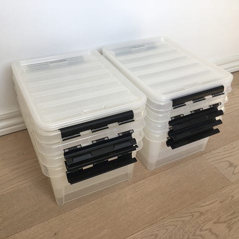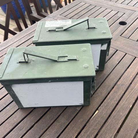 Kasserne er brugt til sterilisering på hospitaler, men er perfekte til opbevaring. De er lavet af metal og er derfor solide. Der er spænder til at lukke dem. De har håndtag til at bære dem. De er lavet til at blive stablet. Bemærk at der er små hullet ovenpå så der kommer luft ind.