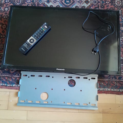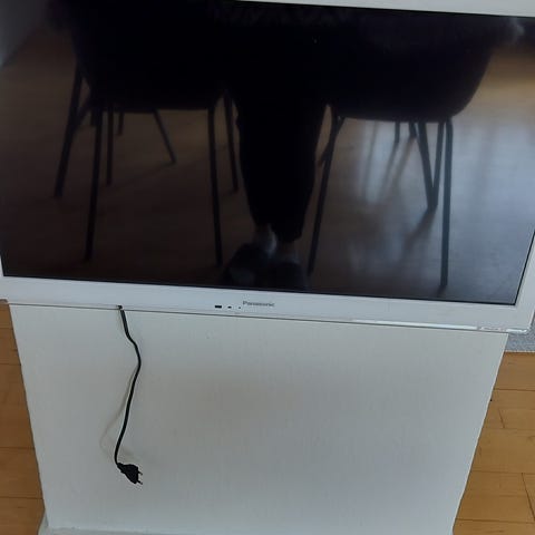 Panasonic 32” fladskærms-tv i sort. Tv’et står på fod og har tilslutningsmuligheder på bagsiden, herunder flere HDMI- og andre indgange til eksternt udstyr. Der medfølger fjernbetjening og strømkabel, som ses på billederne. Velegnet som almindeligt tv eller sekundær skærm i f.eks. soveværelse eller kontor, afhængigt af behov og tilsluttet udstyr.