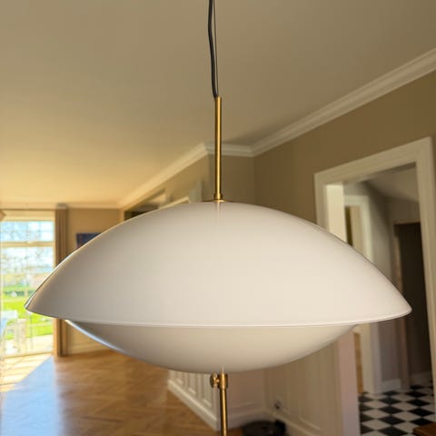 Lampen har stadig prismærke. Den er hængt op, men kun brugt i 2 dage, da vi fik en ny i gave.