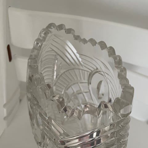 Vintage krystalvase, sandsynligvis fra det 20. århundrede, præget af et klassisk slebet mønster med stjerneformede detaljer på foden.