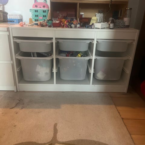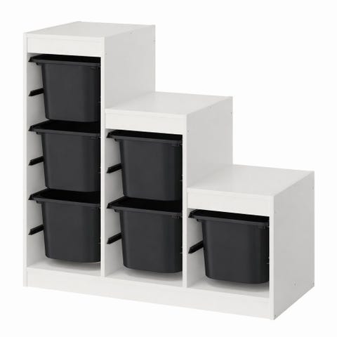 IKEA TROFAST opbevaringsreol til børneværelset med plastkasser til opbevaring i hvid, orange og gul.