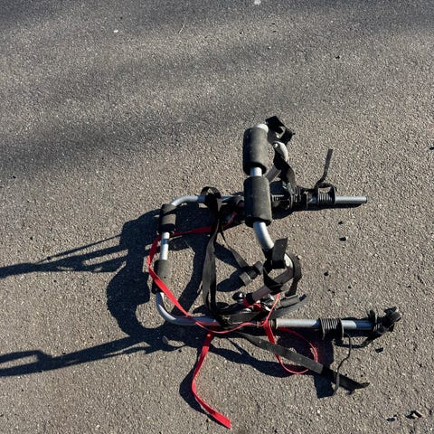 Modellen er udført i sort plast og metal med flere justerbare arme og remme til fastgørelse af cykler.