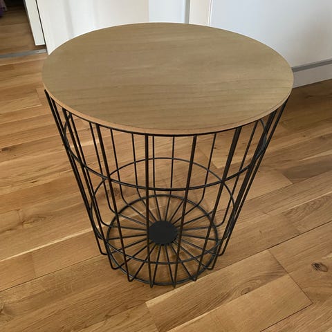 IKEA bord/kurv i hvidt metal. Rund trådkurv med aftagelig, rund bordplade i hvid. Kurven kan anvendes som sofabord, sidebord eller opbevaringskurv, hvor indholdet kan skjules under bordpladen. Design af Peter Opsvik.
