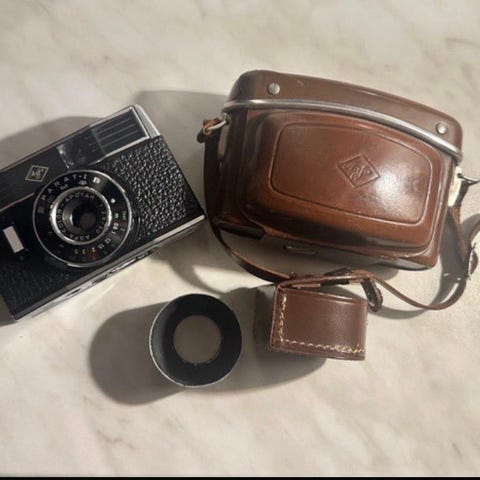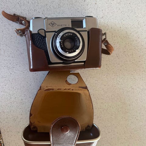 Agfa analog kamera med tilhørende brunt læderetui. Sættet omfatter kamera i metalhus, formtilpasset lædertaske med skulderrem samt ekstra små læderetuier til tilbehør. På billederne ses desuden en blå Voigtländer-æske og diverse tilbehørsdele. Kameraet er et klassisk analogt filmkamera egnet til 35 mm film (type ikke nærmere angivet på billederne). Velegnet til brug for analog fotografering eller som samlerobjekt inden for klassiske kameraer og fotoudstyr.