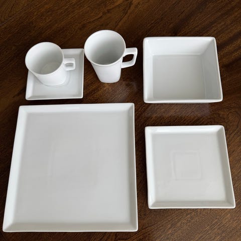 aida hvidt stel tallerkener og kopper i porcelæn. Sættet omfatter middagstallerkener, dybe tallerkener og mindre tallerkener samt kopper med underkopper. Neutralt, hvidt design egnet til både hverdag og mere formelle måltider. Kan kombineres med andet hvidt porcelæn i køkkenet. Samt glas.