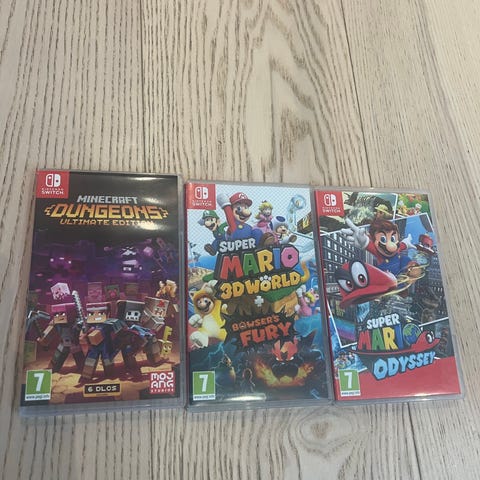 Nintendo Switch Minecraft Dungeons Hero Edition spil. Fysisk spil til Nintendo Switch-konsol. Udgaven er Hero Edition, som indeholder grundspillet Minecraft Dungeons samt ekstra digitalt indhold ifølge omslaget. Spillet er PEGI 7-mærket og kan spilles solo eller i samarbejde med andre spillere lokalt eller online, afhængigt af konsollens funktioner og abonnement. Leveres på Nintendo Switch-spilkort i originalt plastcover.