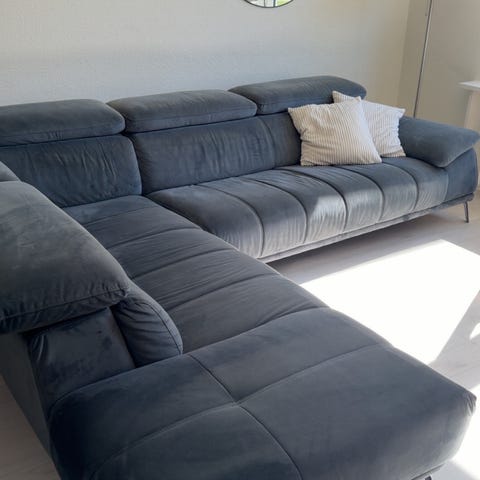 Velour hjørnesofa med målene ca. 240x300 cm. Sofaen er velegnet til stue eller opholdsrum og giver god siddeplads langs to sider. Medfølgende matchende tæppe.