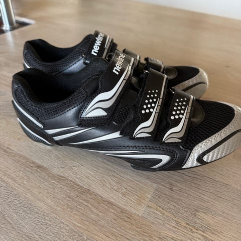 Newline cykelsko i størrelse 44. Modellen er sort med tre velcrostropper over foden for justerbar pasform. Overdelen er perforeret for ventilation, og indersiden har polstret foring omkring anklen. Skoene er udstyret med klamper monteret under sålen, kompatible med racercykel-pedalsystem (3-bolts montering).