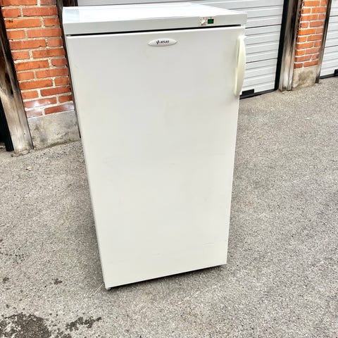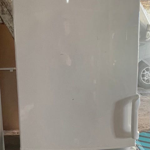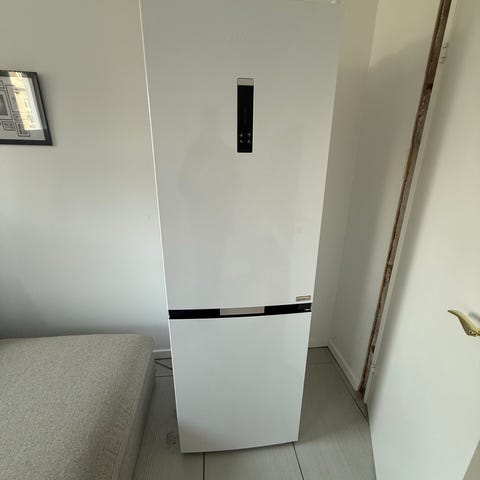 Delonghi køle-fryseskab i hvid. Skabet har køledel øverst og frysedel nederst. Fronten er glat med integreret håndtag og vanddispenser i døren på køledelen. Købt december 2024 i Elgiganten, så stadig garanti og kvittering medfølger, står som nyt