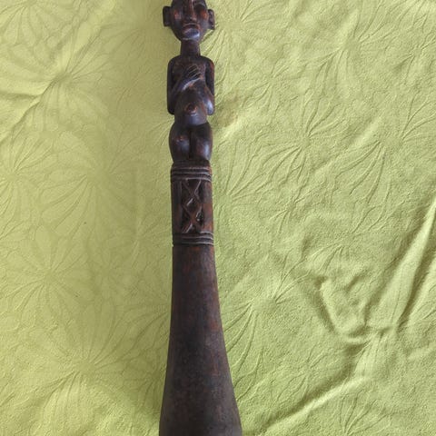Ukendt mærke håndlavet strengeinstrument i brun træ. Instrumentet har rund resonanskasse, formentlig af kalabas eller lignende materiale, med skind på oversiden og flere strenge spændt over en lille træbro. Halsen er udskåret i træ og afsluttes med et udskåret hovedmotiv. Velegnet som dekoration på væg.