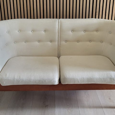 Hans J. Wegner sofa med sort stof i små tern. Let misfarvningen af stof og slid på træ.