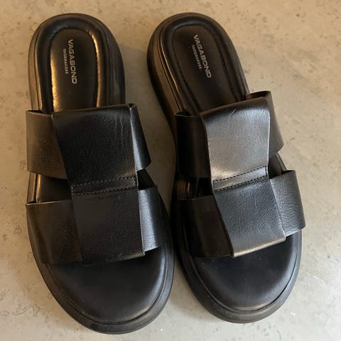 Vagabond sandaler i str. 39. Åbne sandaler med justerbare remme over forfod og om hæl. Sandalerne har brun overdel i tekstil med kontrastfarvede remme og lys mellemsål. Ydersålen er i gummi med mønster for bedre fodfæste. Velegnet som hverdagssandal i varmt vejr.