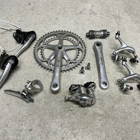 Her sælges dette Campagnolo krank sæt fra 1993. Sættet trænger til at blive pudset lidt op og pedalerne sidder godt fast.