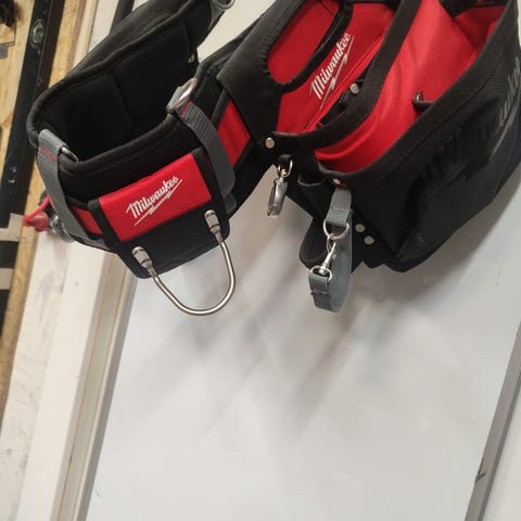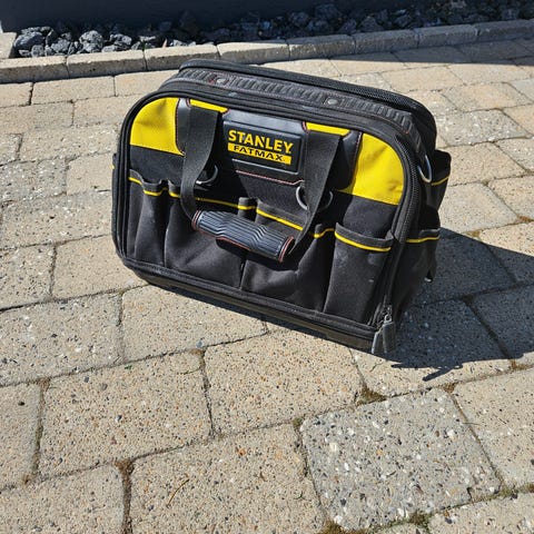 Stanley værktøjsbælte taske med flere lommer i sort stof med gule detaljer. Tasken har flere rum og lommer til opbevaring af håndværktøj, søm, skruer og tilbehør. Foran er der mindre lommer til mindre dele samt en metalbøjle til ophæng af værktøj. Egnet til brug sammen med værktøjsbælte til håndværkere eller gør-det-selv arbejde.