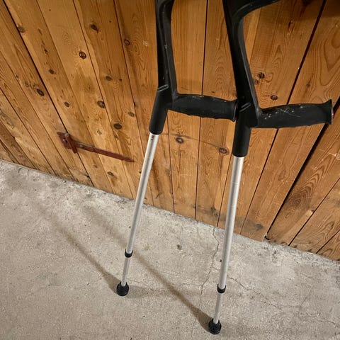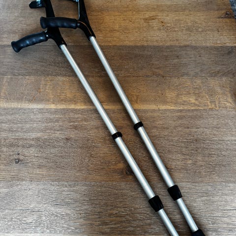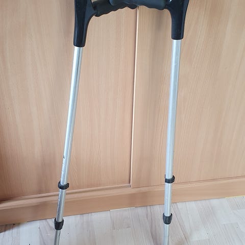 Krykker i grå farve. Modellen er højdejusterbar med flere huller i skaftet, så længden kan tilpasses brugeren. Krykkerne har underarmsstøtte og håndtag i plast samt gummifødder i bunden for bedre stabilitet mod underlaget. Velegnet som ganghjælpemiddel til voksne, der har behov for ekstra støtte ved gang eller under genoptræning.
