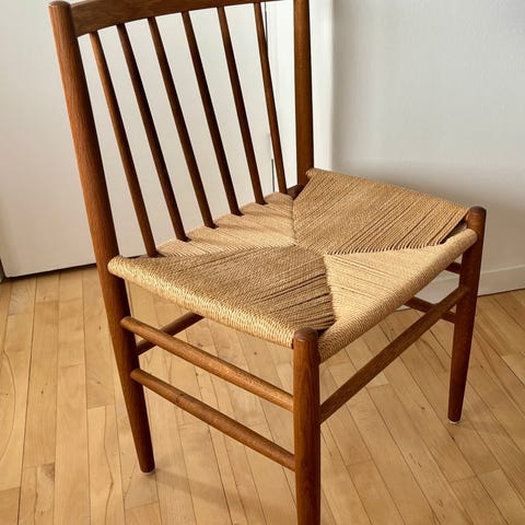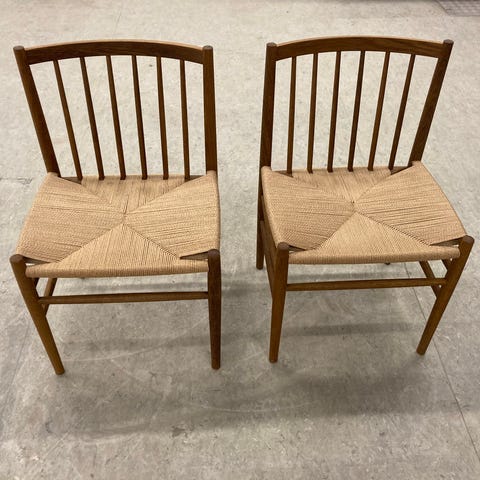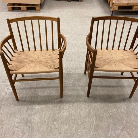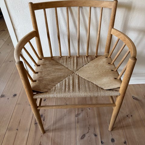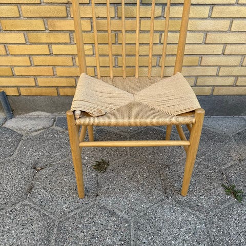 Jørgen Bækmark j80 stol i røget eg. Ca 5 år gammel. Bemærk at den ene pind i sædet er knækket i begge sider, så den er ikke til at sidde på pt. Stolen skal derfor repareres og givetvis omflettes. Alternativt kan den måske bruges som reservedele?