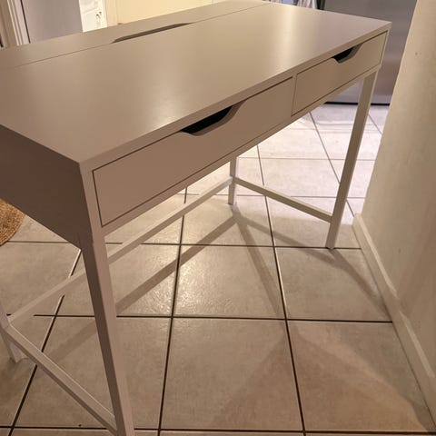 Fint og velholdt skrivebord. IKEA Alex. Lidt brugsspor her og der. Noget kan måske fjernes med lidt større indsats end min.