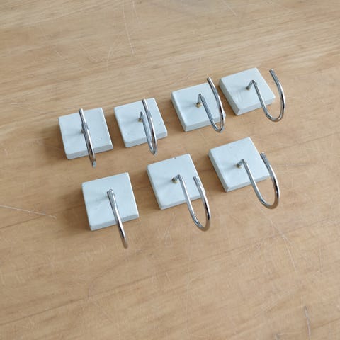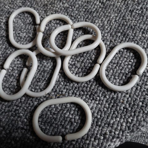 Sæt med hvide plastik karabinhager. Velegnet til ophæng, samling af mindre genstande eller organisering, f.eks. i hjemmet, garderoben eller til tasker og nøgler. Ovale led, der kan åbnes og lukkes enkeltvis.