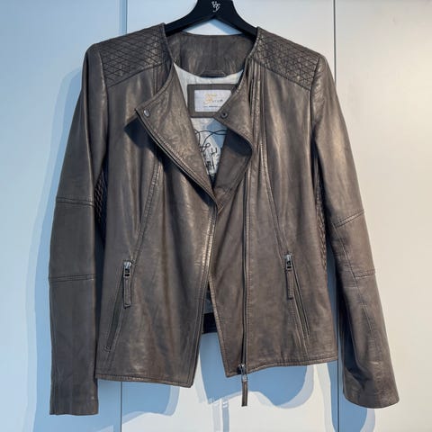 Gestuz læderjakke til kvinder i brunlig farve, størrelse 42. Jakken har ikke været brugt og fremstår derfor som ny. Jakken er foret med et glat for. Den har et klassisk bikerinspireret snit med asymmetrisk lynlås foran. Udstyret med lynlåslommer i siderne, lynlåse ved ærmerne samt justerbart bælte i taljen. Egnet som overgangs- og yderjakke til hverdagsbrug.