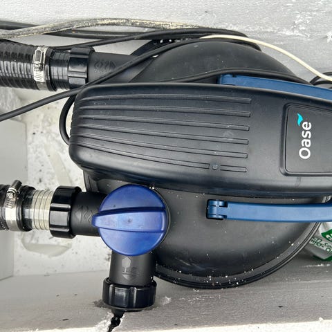 Havedam med sort damfolie og integreret pumpe- og filteranlæg i trækasse. Damfolien er lagt i en aflang formet dam, omkranset af sten. Pumpe- og filteranlægget er forbundet med slanger og placeret i en trækasse ved siden af dammen. Velegnet som havedam til have eller gårdhave, eventuelt til fisk eller vandplanter efter opsætning og rengøring.