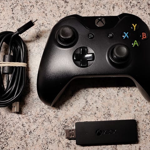 Microsoft Xbox One controller i sort. Trådløs gamepad med to analoge styrepinde, styrekors, skulderknapper og farvede A/B/X/Y-knapper. Forsiden er sort, mens batteridækslet på bagsiden er hvidt. Egnet til brug med Xbox One-konsoller og kompatible enheder, der understøtter Xbox One-controllere.