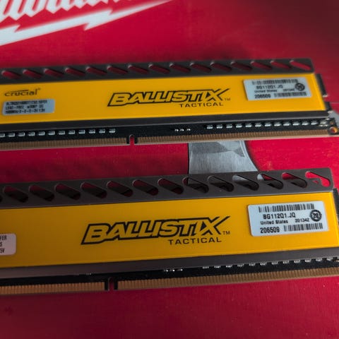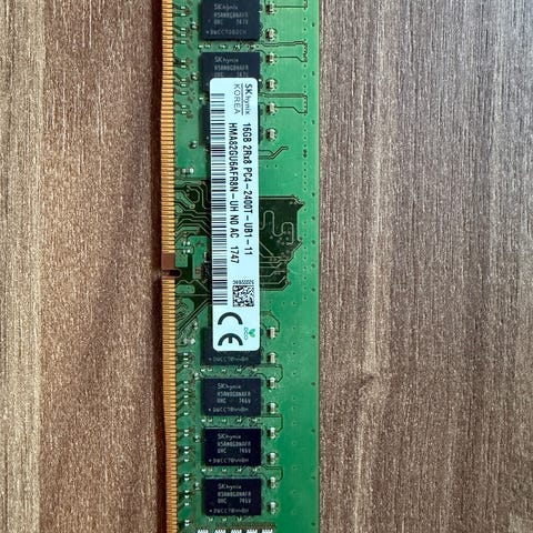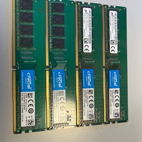 Crucial/Kingston RAM modul til stationær computer. Standard grøn printplade uden kølerprofil. Velegnet som udvidelse eller udskiftning af eksisterende hukommelse i kompatible systemer. Nærmere tekniske specifikationer som kapacitet, hastighed og type bør kontrolleres på mærkaterne eller ved at sammenligne med bundkortets understøttede RAM-typer.