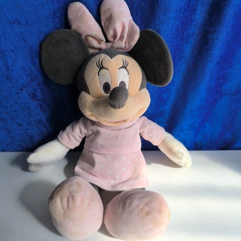 Disney Minnie Mouse plysdyr i lyserød. Sættet består af to figurer: én klassisk Minnie Mouse bamse i lyserød kjole med hvide prikker samt én blød Minnie Mouse med lille tæppe i lyserød og med sløjfe. Begge dele er fremstillet i blødt plys og egner sig til leg og hygge for mindre børn.