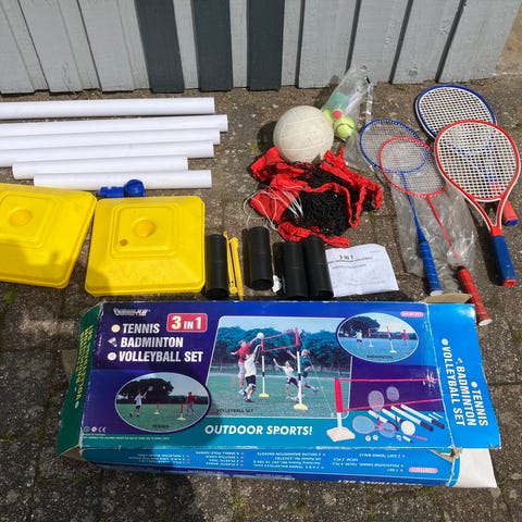 Farverigt bowlingsæt til børn med klassiske kegler - Kun brugt én gang. Sæt keglerne op, tag chancen, og slip kuglen. Hvis du er heldig, laver du et strike og vælter alle keglerne på én gang. Kuglerne er lette og nemme at gribe for små fingre. Sjov både til at spille alene og til spil med venner og familie. Kan spilles både indendørs og udendørs. Leveres i nettaske til opbevaring. 2 sæbeboblesværd - Aldrig brugt.