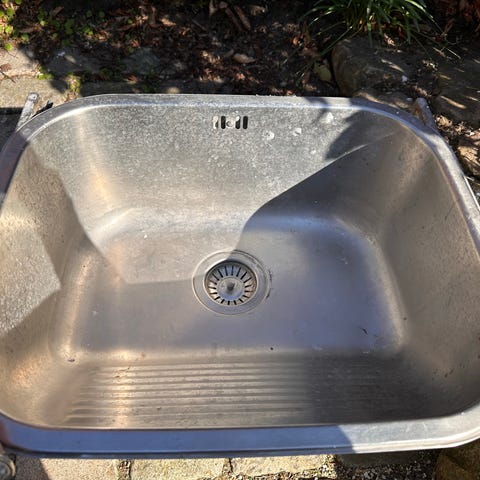 Flot stor stålvask inkl. armatur. Trænger til rengøring og afkalkning, men fejler ikke noget. 54,5cm x 47,5cm med kant. Selve vask er cirka 47x33cm.